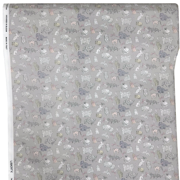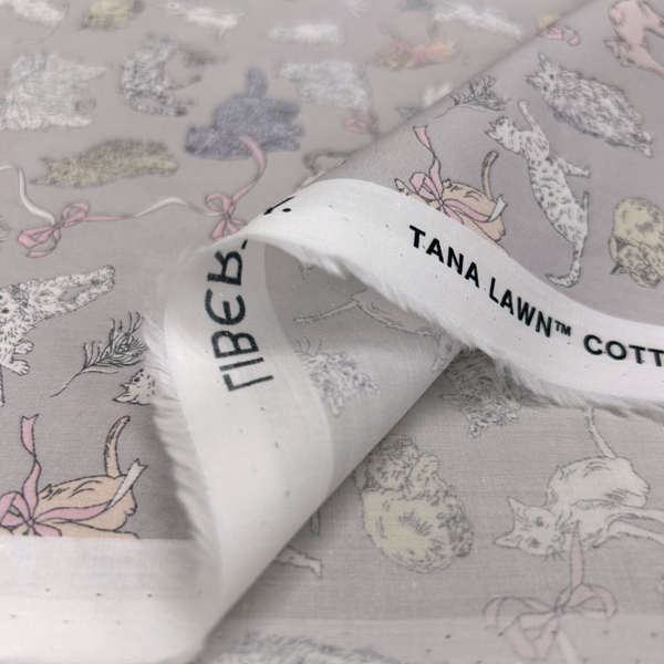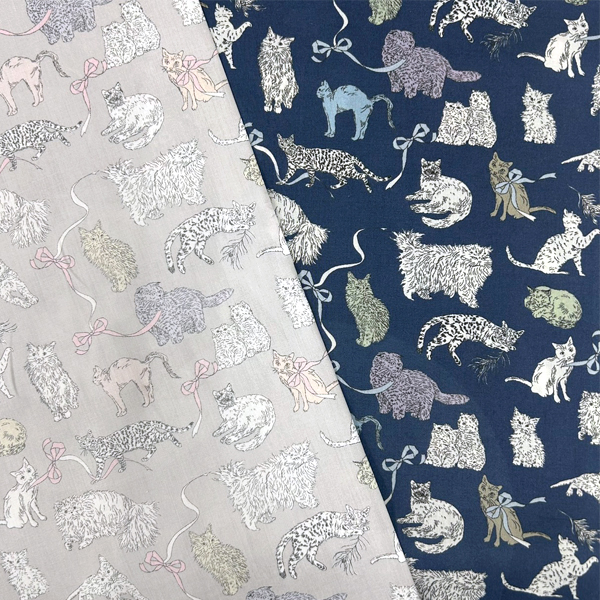 愛らしいキャラクター豊かな猫たちが、遊んだりくつろいだり、思い思いに動き回る会話のようなパターンです。リバティの人気デザイン「ミャウ(Meow)」から着想を得たこの新たな作品は、日本と英国のリバティスタッフが実際に飼っている猫たちをモチーフにしています。鉛筆で描かれたイラストは、リボンや蝶結びの間を遊び回る猫たちの愛らしい仕草と、自由でユーモラスな個性を見事に捉えています。