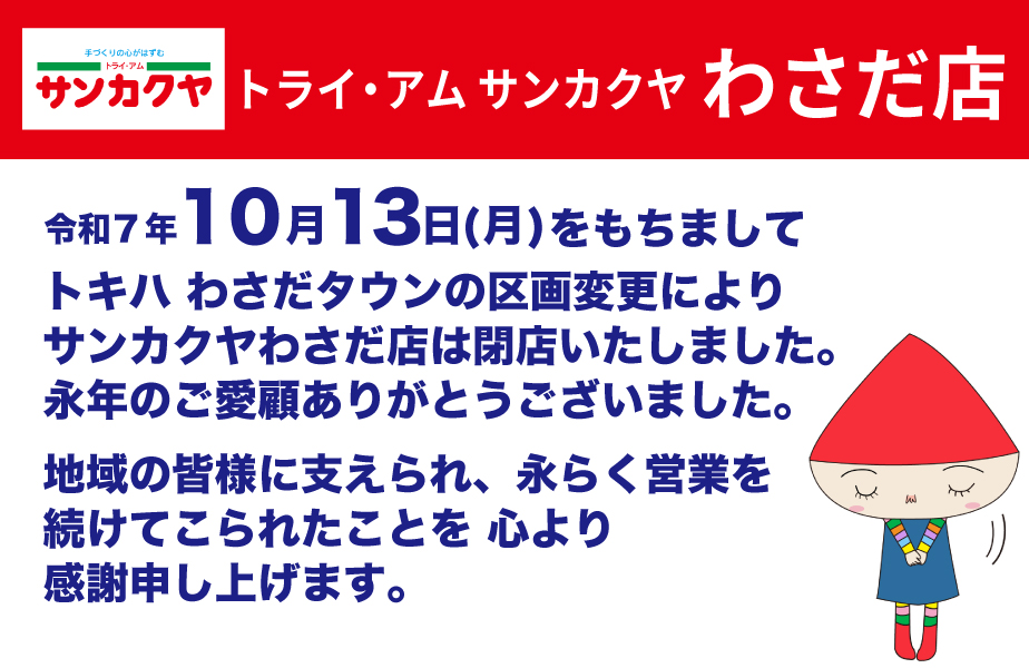 トライ・アム サンカクヤわさだ店は、令和7年10月13日(月)をもちまして、トキハ わさだタウンの区画変更により閉店いたしました。