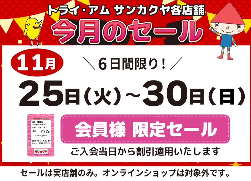 トライ・アム サンカクヤ各店舗にて、下記の日程で会員様限定セールを開催いたします。