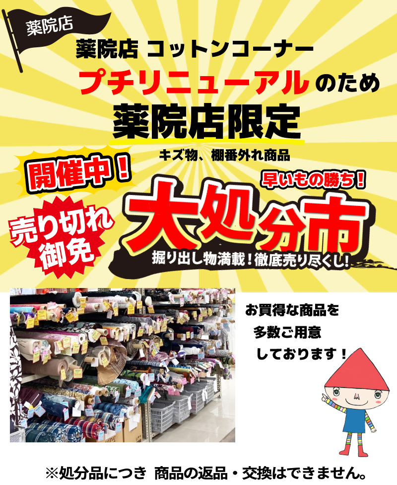 この度、コットンコーナーをプチリニューアルいたしましたので、棚番外れやキズ物を集めたお買得品コーナーにて大処分市を行っております。