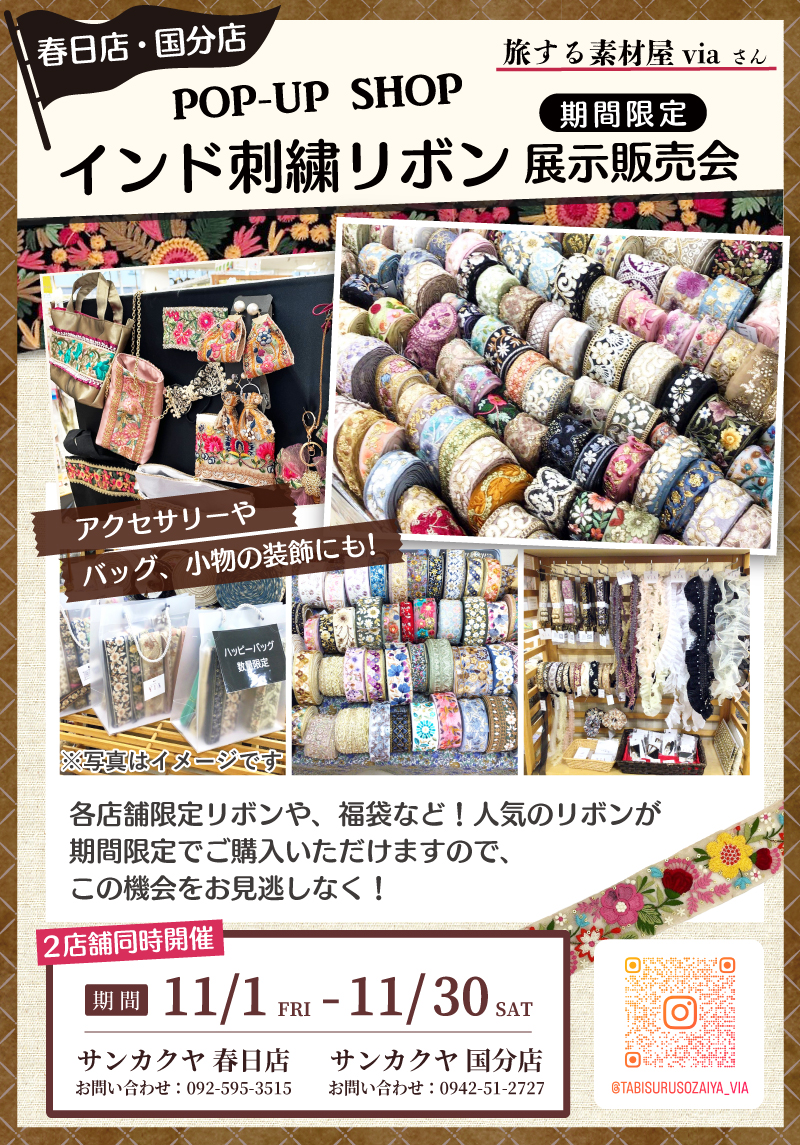 インド刺繍リボンで人気の「旅する素材屋via」さんのポップアップショップが、サンカクヤわさだ店でご好評いただいておりますので、サンカクヤ春日店、国分店でも開催していただけることになりました!