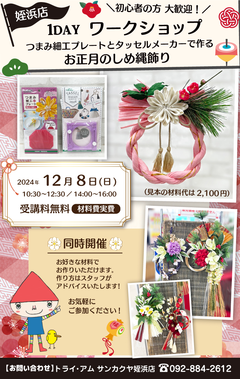 サンカクヤ姪浜店にて、お正月のしめ縄飾りの1DAY体験講習会を開催いたしますのでお知らせいたします。