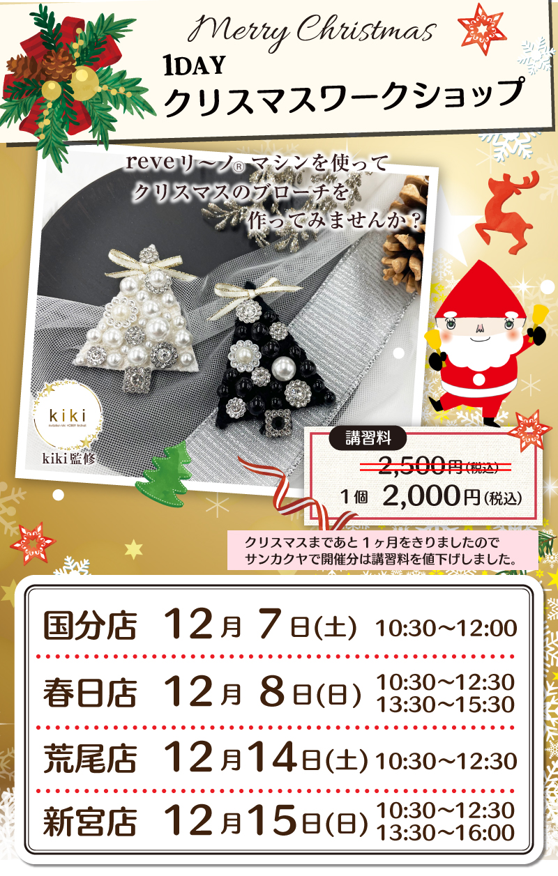 kiki監修「クリスマスブローチ」1DAYワークショップをサンカクヤ各店で開催いたします。