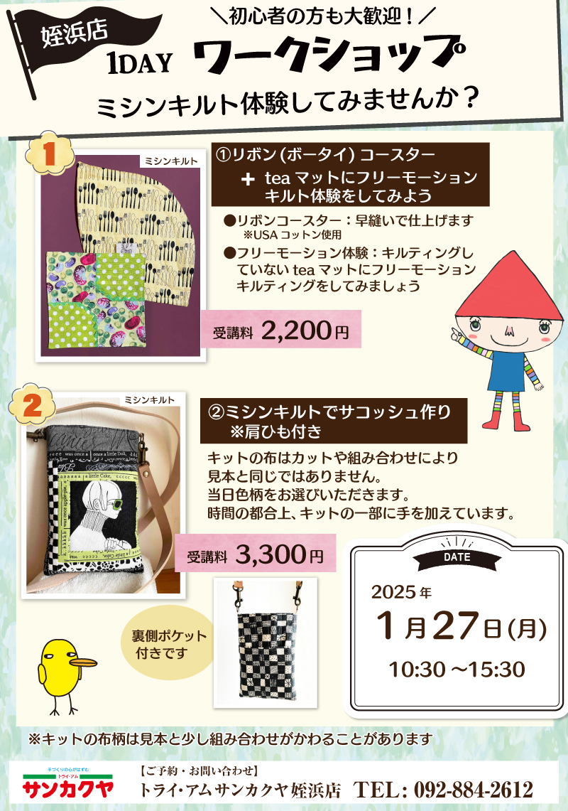 サンカクヤ姪浜店にて、ミシンキルトの1DAYワークショップを開催いたしますのでお知らせいたします。