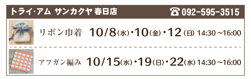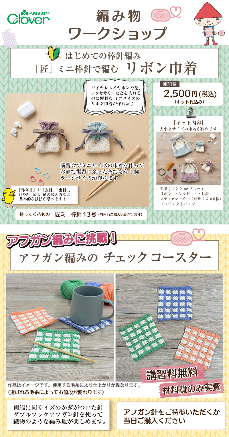 クロバーさんとのコラボワークショップ「「匠」ミニ棒針で編む リボン巾着」「アフガン編みのチェックコースター」をサンカクヤ各店で開催いたします。