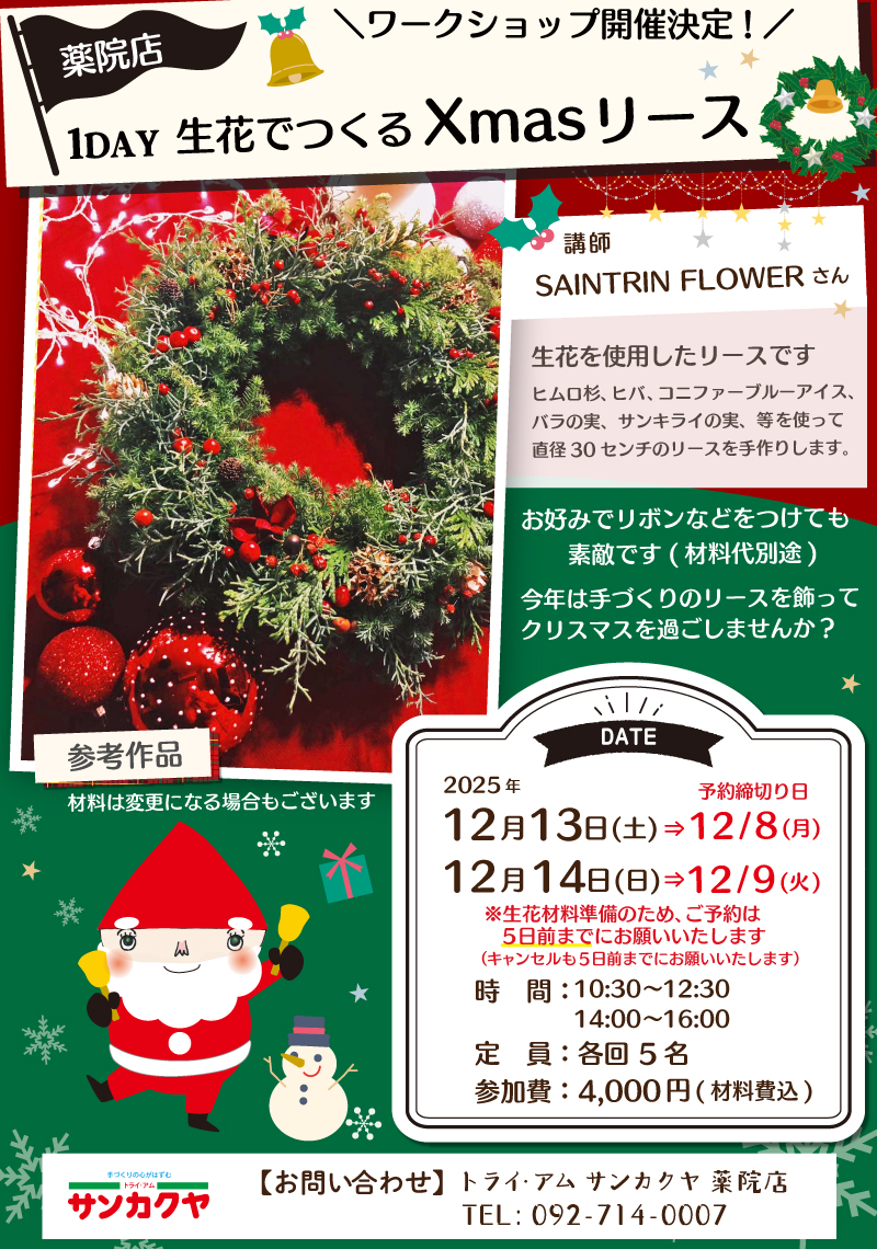 サンカクヤ薬院店より、1DAY、Xmasリースのワークショップのお知らせです。