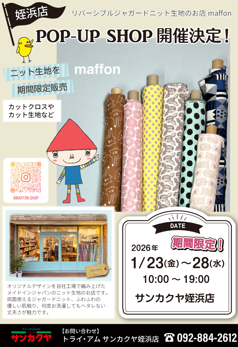 サンカクヤ姪浜店にて、リバーシブルジャガードニット生地のお店「maffon」さんのポップアップショップを開催いたします。