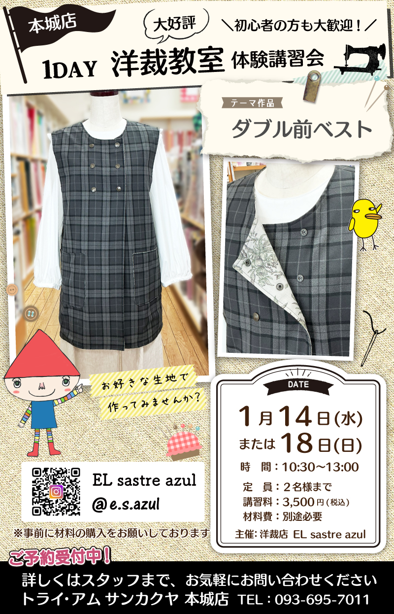 サンカクヤ本城店より、1DAY洋裁教室のお知らせです。