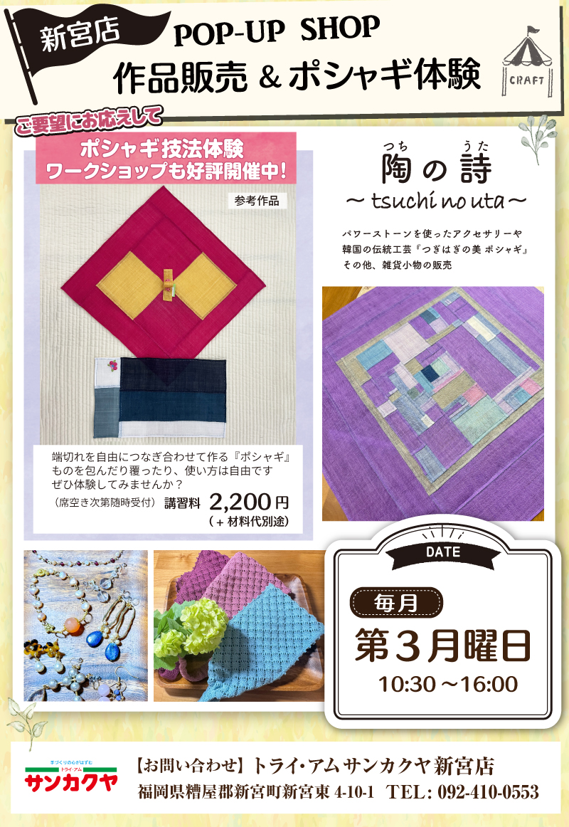 その他、雑貨小物の販売のほか、ご要望にお応えして、ポシャギ技法体験ワークショップも好評開催中です!