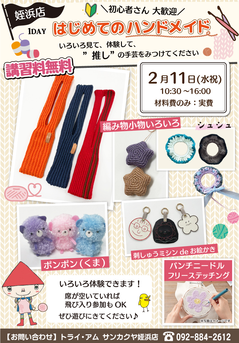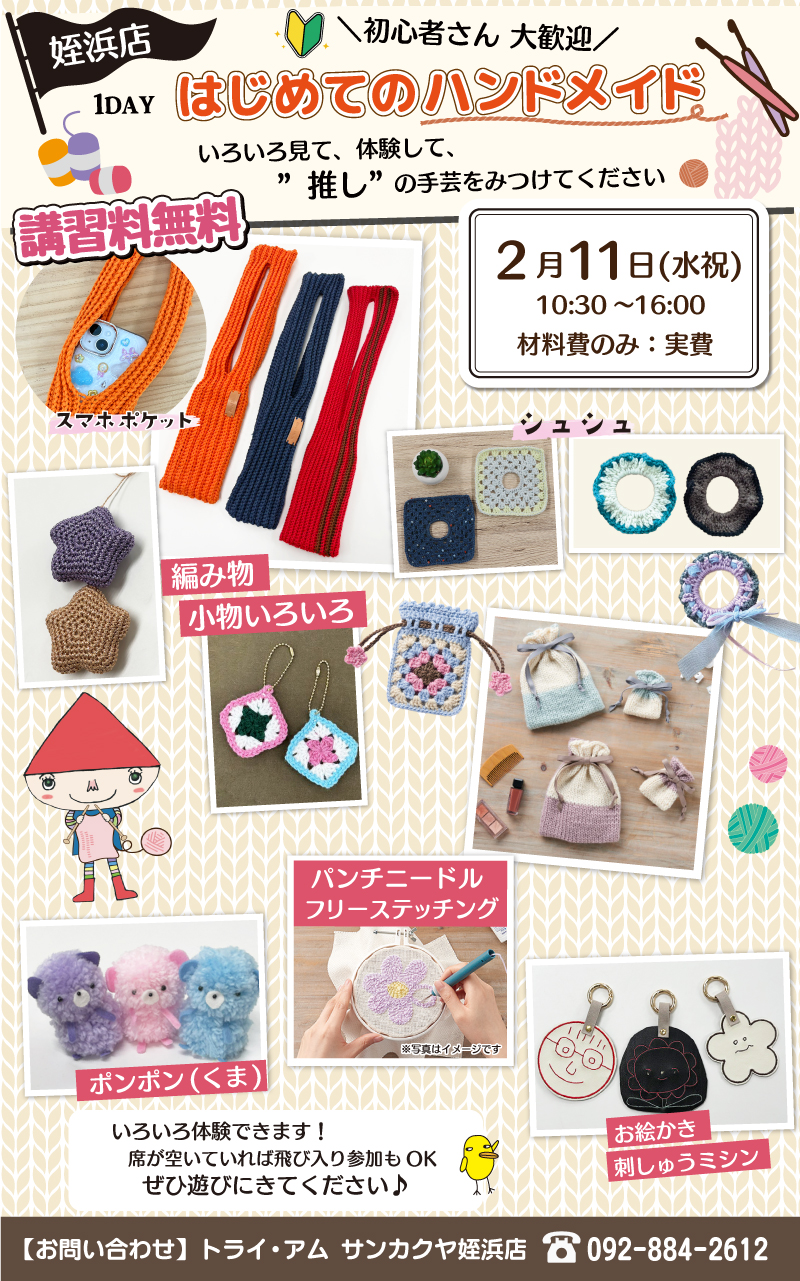 サンカクヤ姪浜店にて、1DAY「はじめてのハンドメイド」を開催いたしますのでお知らせいたします。