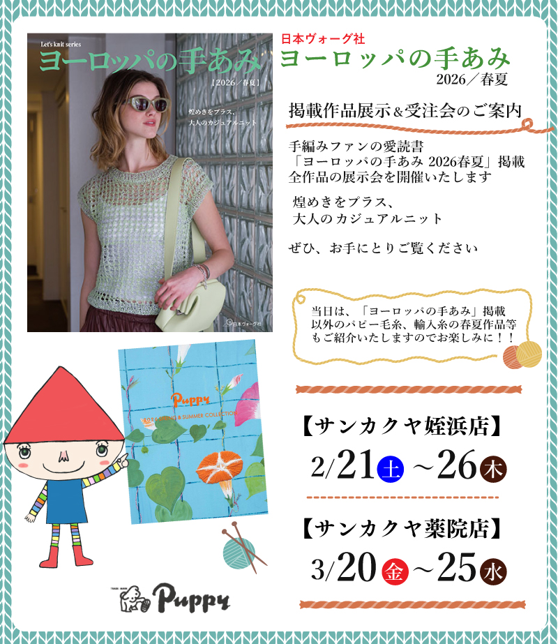 また、「ヨーロッパの手あみ」掲載以外のパピー毛糸、輸入糸の春夏作品等も紹介いたしますのでお楽しみに!!