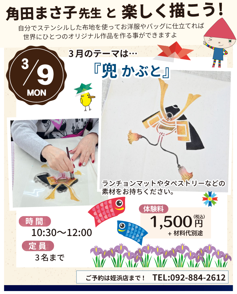 北海道、東京、名古屋、大阪、福岡で教室を開催されている角田まさ子先生が、ファブリックステンシルの楽しさを教えにサンカクヤ姪浜店に毎月1回来ていただいています。