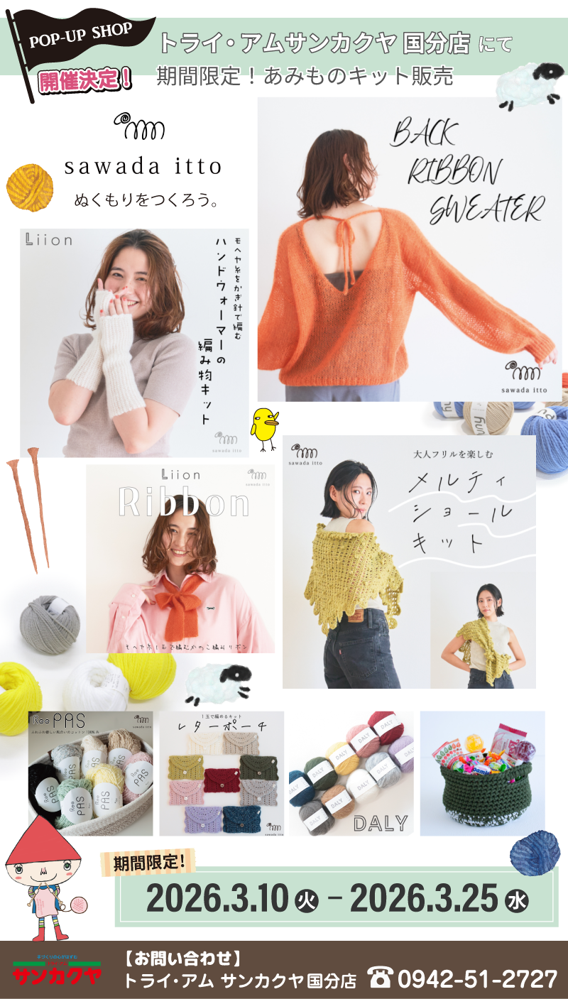 サンカクヤ国分店にて、ニットの面白さや可能性を広げるような、ユニークな価値ある糸づくりを大事にする糸屋さん「sawada itto(サワダイット)」さんのポップアップショップを開催いたします。