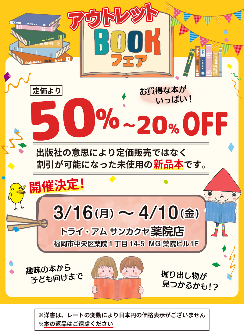 大好評のアウトレットブックフェアをサンカクヤ薬院店で期間限定で開催いたします。