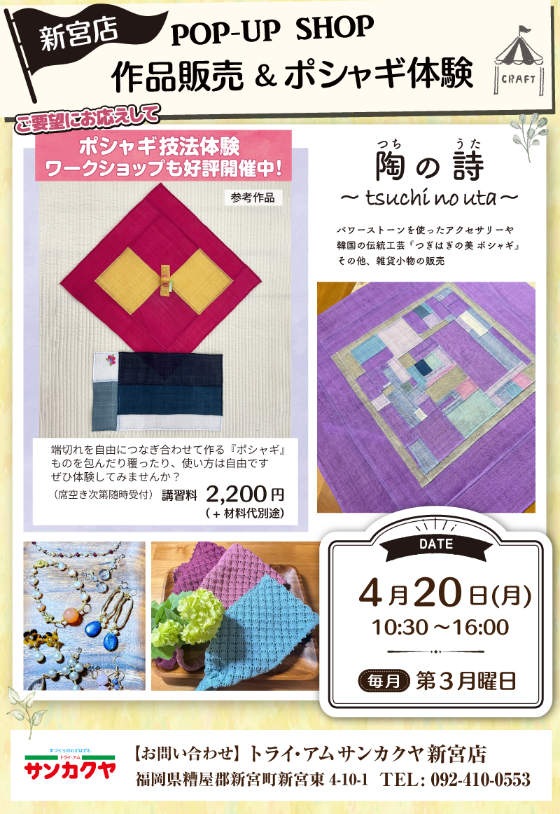 その他、雑貨小物の販売のほか、ご要望にお応えして、ポシャギ技法体験ワークショップも好評開催中です!