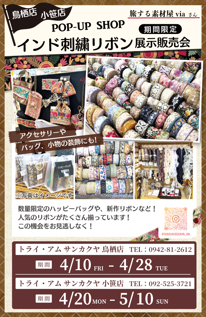 毎回ご好評いただいております、インド刺繍リボンで人気の「旅する素材屋via」さんのポップアップショップを、次回はサンカクヤ鳥栖店・小笹店で開催いたします!